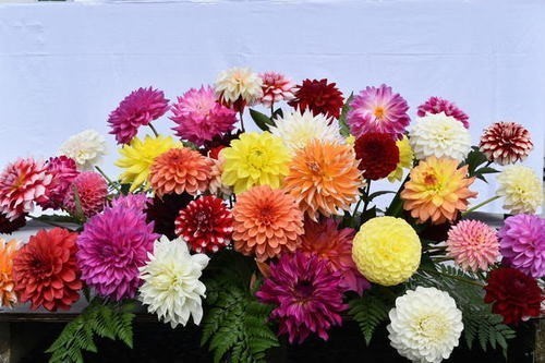 ダリアは、日本に1842年(天保13年)頃、オランダより長崎出島を経由して江戸巣鴨に導入されたと言われる花ですが、当時は「天竺牡丹」と呼ばれていました。その後明治時代を迎える頃には呼び名が「ダリヤ」となり、明治30年頃から急に栽培がさかんになり、大正から昭和初期にかけて最高になったと言われています。その頃に「Dahlia」のスペルに順ずる「ダリア」と呼ばれるようになりました。当時は趣味として広く愛好され、切り花や鉢植えとしての栽培は比較的少なかったようです。第2次世界大戦中はダリアにとって暗黒の時代であり、1~2年は花の栽培禁止、防空壕を作るために栽培されなかったようです。