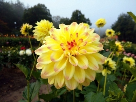 新ダリヤ園は、旧ダリヤ園のすぐ近くで、川西町浴浴センター“まどか”(川西温泉)の眼下に広がります。新ダリヤ園には4ヘクタールの公園内に、650品種、10万本のダリアの花が咲き誇ります。